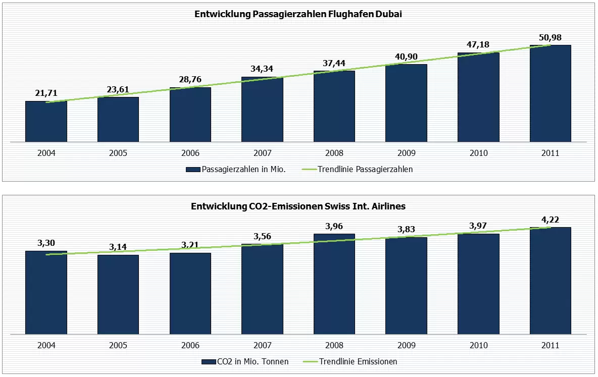 Entwicklungsdiagramme: Die beiden Diagramme sollen je eine Entwicklung darstellen. Einerseits bildet der Flughafen von Dubai die Entwicklung der weltweit rasant wachsenden Passagierzahlen ab und andererseits haben wir als Vergleich die CO2-Emissionen unseres Interviewpartners Swiss hinzugezogen.