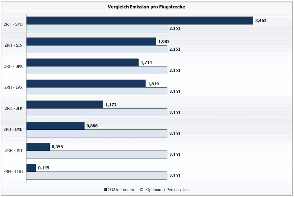 Vergleichsdiagramm: Die verschiedenen Destinationen zeigen auf, wie viele Tonnen CO2 mit nur einer Flugstrecke ausgestossen werden. Als Vergleich dazu dient der Jahreswert an CO2-Emissionen, bei dem die Natur nicht überlastet wird und dem Treibhauseffekt entgegengewirkt werden kann.