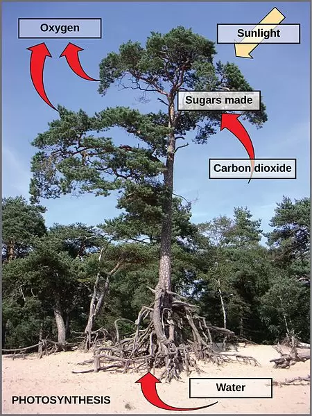 In the picture above, you can see the photosynthesis of a tree. It shows how the tree transforms light energy into chemical energy. Photosynthesis captures energy from sunlight and is then used to convert water, carbon dioxide, and minerals into oxygen.