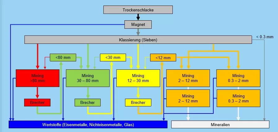 Die Schlackenaufbereitungsanlage verarbeitet nach Entfernung der Grobteile drei Fraktionen (0.3-12mm, 12-30mm, 30-80mm). Das in der groben Fraktion nach Metallentfernung übrigbleibende Material wird gebrochen und wiederum in die entsprechenden Fraktionen ausgesiebt. Die Feinfraktion 0.3-12mm wird in 4 Unterfraktionen aufgeteilt, um eine maximale Effizienz bei der Nichteisenmetallentfernung zu garantieren.