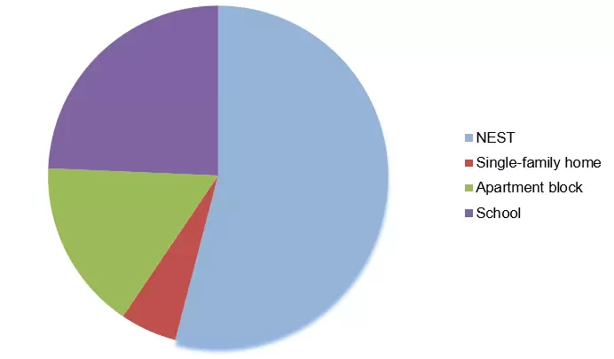 We thought that the costs for the construction of the Nest building would contain about 10 millions. In fact the amount is twice expensive than the three other buildings, which are obviously cheaper than the Nest. However the Nest is built with recycled materials. The thing is that the Nest costs were high for the construction, but for the future they will not have high costs, because the new innovation has sustainable electricity and heating. Those are self-made by the building and don’t need to be taken from external manufacturing. In an apartment block or in the school they will have high costs after the construction (for example heating, electricity etc.). So the Nest is well-balanced.