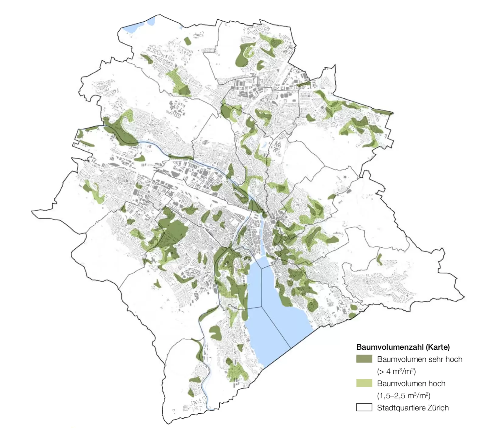 From a size of around one hectare, green spaces in the settlement area can deliver cooler air to neighbouring quarters via air exchange processes and thus also represent climatic oases as retreat and relaxation areas. The choice of green spaces is limited within the settlement area of the city of Zurich. The green spaces that are particularly effective for the cold air system are mainly outside of the settlement area. Linked forest areas, fields and meadows are important cold air generation areas that provide oxygen-rich, dust-free, little polluted air. The networking of green spaces takes place through the greening and planting of streets and paths with trees and through the development of regular stepping stones, for Ex. in the form of small parks and open spaces but also gardens. For optimal effectiveness, it is advisable to have as diverse open space and vegetation structures as possible with large, shady, climate-resistant trees, open lawns and fields, as well as moving water. The shading of the outside area and the building facades leads to a reduction in direct radiation and fight the nightly heat radiation. The resulting coolness of vaporization (Verdampfung) of the vegetation also reduces the bioclimatic burden. [1] [2]