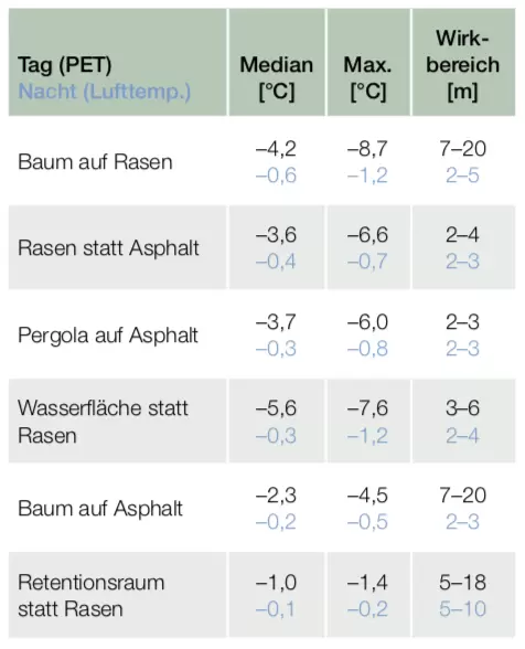 The greatest contribution to improving the quality, make additional trees on lawn. During the day, they reduce the actually felt temperature (PET) by 4.2°C as the median and 8.7°C as the maximum value. The change is especially great here since the evapotranspiration (vaporization (Verdampfung) of water) of the lawn leads to a greater decrease than in the case with a tree over asphalt. Here the temperature decrease is 2.3°C in the median and a maximum of 4.5°C. [1] [4]