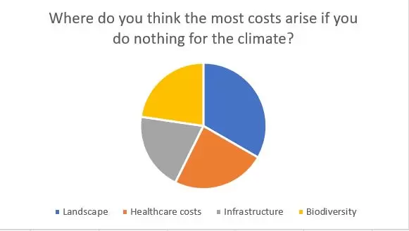 However, she absolutely agreed with us that there will be increased costs for the health system (increasing heat in cities especially affects older people), for infrastructure (damage due to heavy downfall, which will increase, or rockfalls because the permafrost is thawing (auftauen), etc.), in agriculture (crop failures due to droughts(Dürren)). However, increased costs are to be expected in almost all sectors if measures are not taken early.