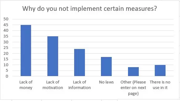 As you can see most people don’t implement measures, because they don’t have enough money. Slightly surprising many people answered the lack of information. As you can see the least chosen one was, because they see no use in it.