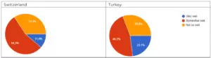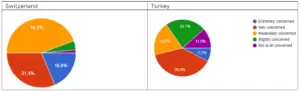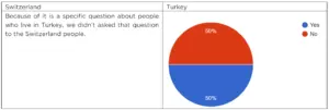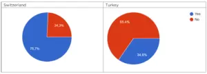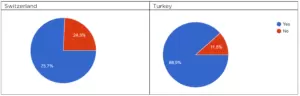 We compared the survey answers of Turkish people, mainly students from Izmir, and the answers from Swiss people, mainly students from business school Wetzikon (wkvw.ch). Unfortunately, we received only 26 answers from Turkey and 70 answers from Switzerland. Below you can see some of the results. We are aware that a comparison is not representative due to the different survey responses. Nevertheless, we decided to share the results. They might give an indication to future teams.