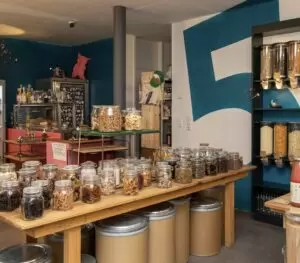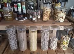 One great way to reduce plastic waste is to do your weekly grocery shopping in an unpacked store instead of a regular supermarket. Unpacked stores sell products which aren’t packaged. You bring your own containers and bags and fill them yourself.