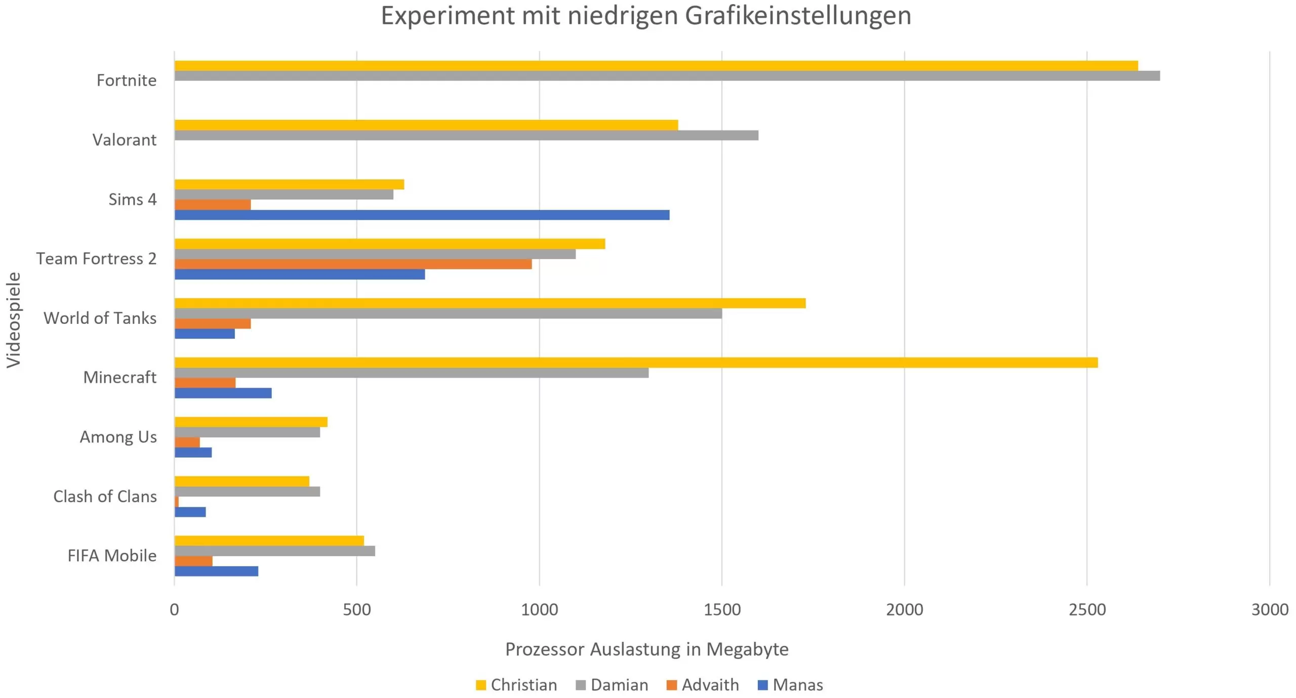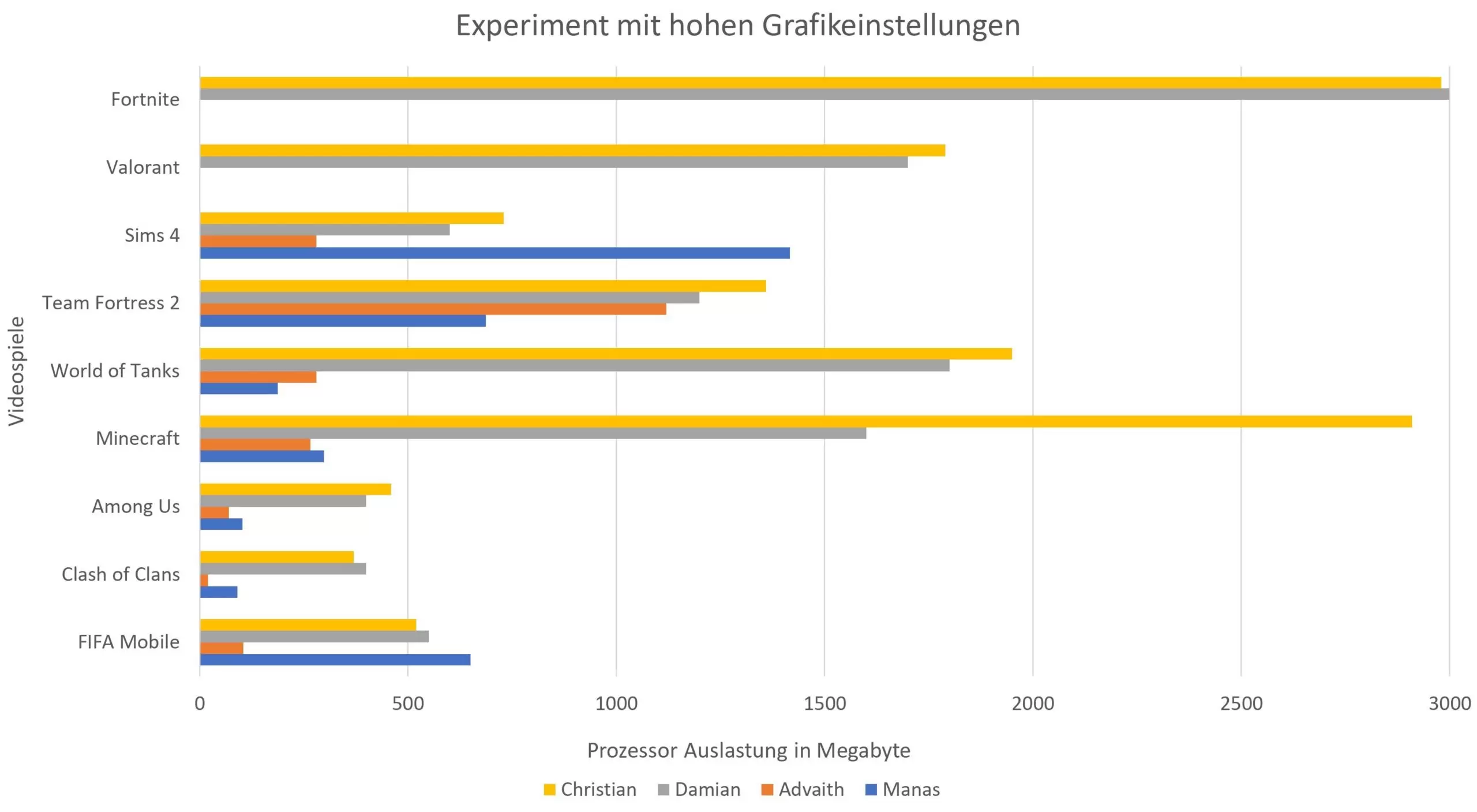 We played different games on different devices and measured the power consumption when we set different graphics settings. That means we played each game once with high graphics settings and once with low ones. We put all this on a list. (The results are shown below) First we all agreed together which games we would play. Then we all individually played each game for a while and measured the power consumption. On the desktop PCs and laptops, the whole thing was relatively simple, but on the smartphone, the whole thing was more complicated and we had to calculate with reference values from the Internet.